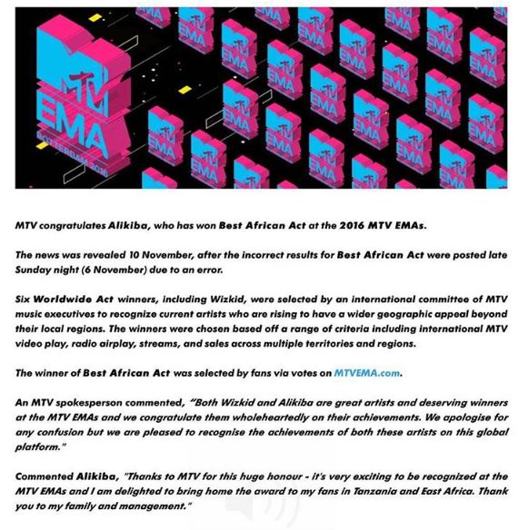However, the award was rescinded and then handed over to Tanzanian singer, Ali Kiba, who according to their website, is the winner of the ‘Best African Act’.