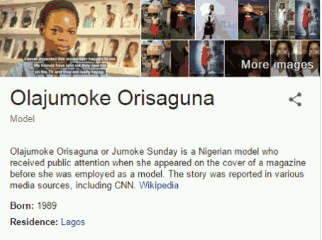 Olajumoke Orisaguna popularly known for her from grass to grace story; the hawker turned model has been profiled by wikipedia.