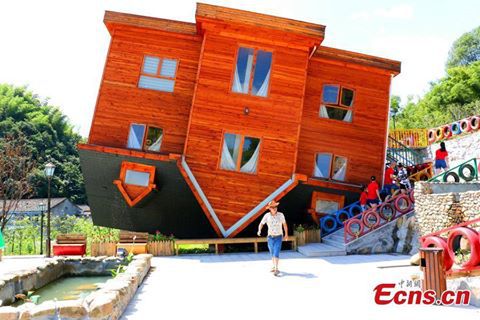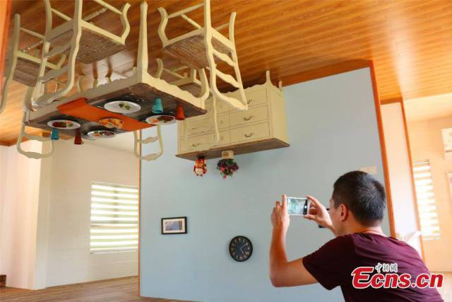 Pictured is a villa that appears inverted in Xikou Township, Fenghua City, East China’s Zhejiang Province. The house has attracted many visitors. Everything inside the villa, such as furniture and dolls, are placed upside down.