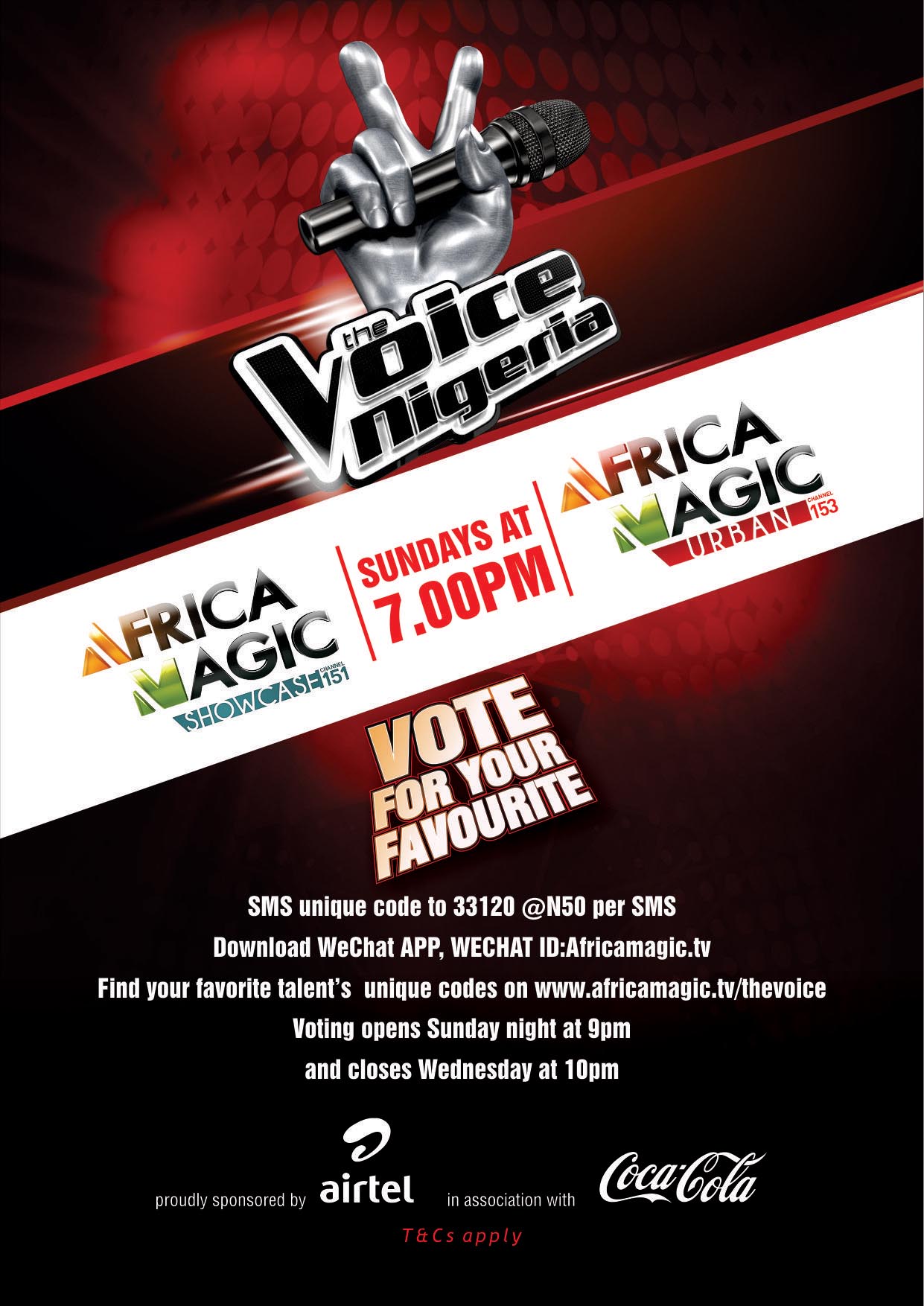 Your favorite talent now has the opportunity to stay on and win The Voice Nigeria! To vote, SMS the unique code to 33120 (N50 per SMS)