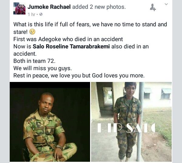 A Nigerian soldier, Salo Roseline Tamarabrakemi was killed in an accident in Port Harcourt, Rivers State on Tuesday evening, October 10… just hours before her birthday. It was gathered that a vehicle rammed into her motorcycle, killing her instantly.