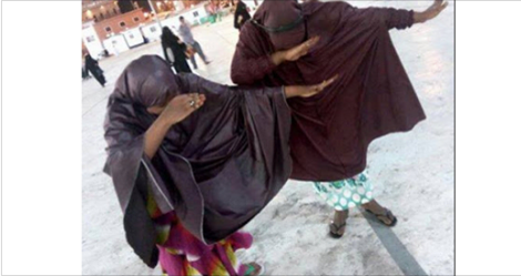This picture which is currently trending socila media..It shows two Nigerian ladies showcasing their dabbing skills while on pilgrimage to Mecca, Saudi Arabia.
